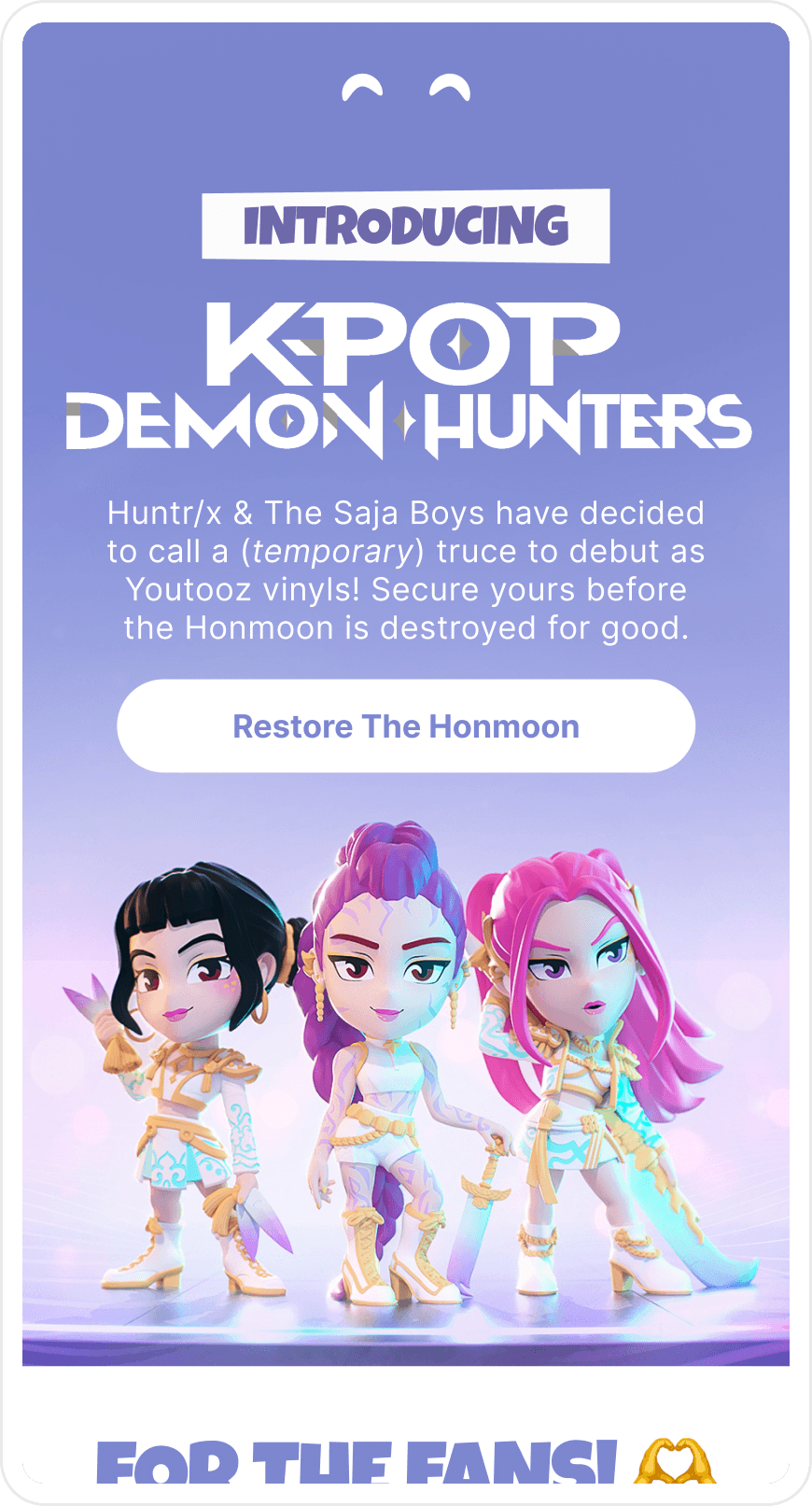 Partnering with over 1,000+ licensed IPs, Youtooz brings the internet’s most memorable moments to life. In the first 90 days, we launched 3 of their largest revenue generating Campaigns of the year.