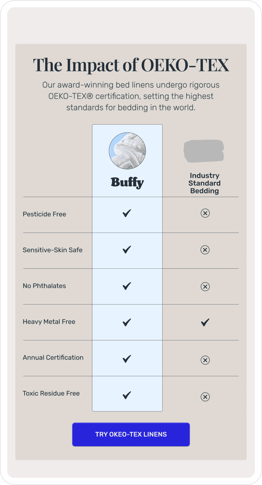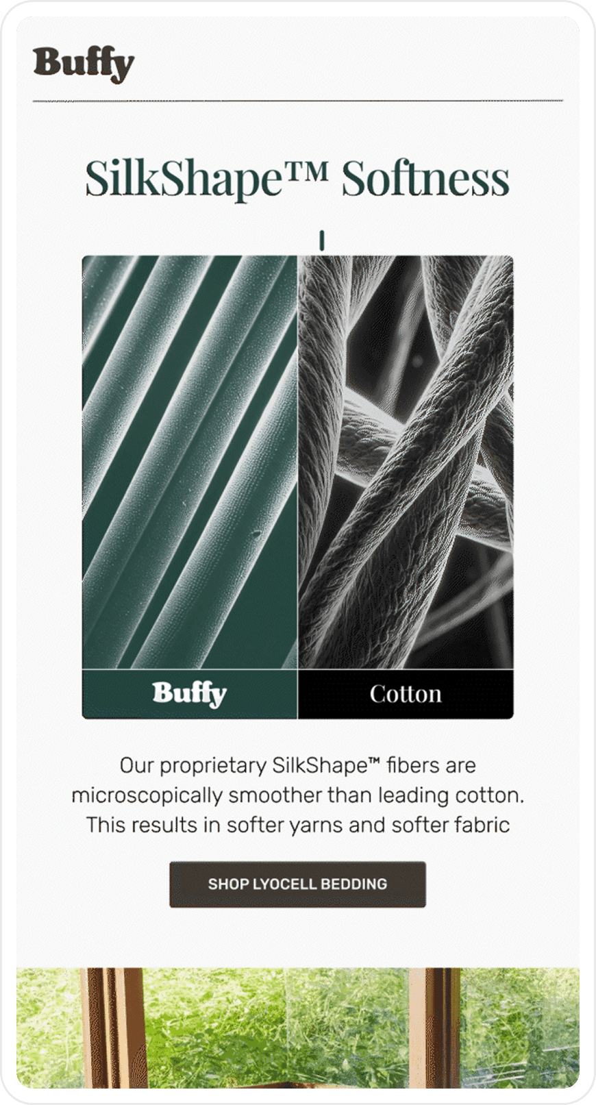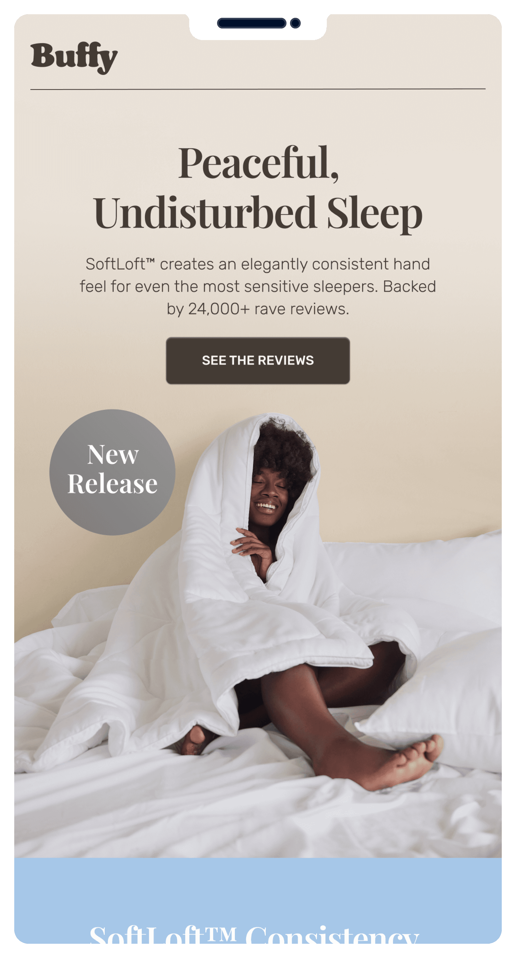 Buffy has transformed the lives of 1 Million+ sleepers with an award-winning range of petroleum-free bedding. In the first 30 days, we increased email revenue by 126% while simultaneously segmenting out dead subscribers.